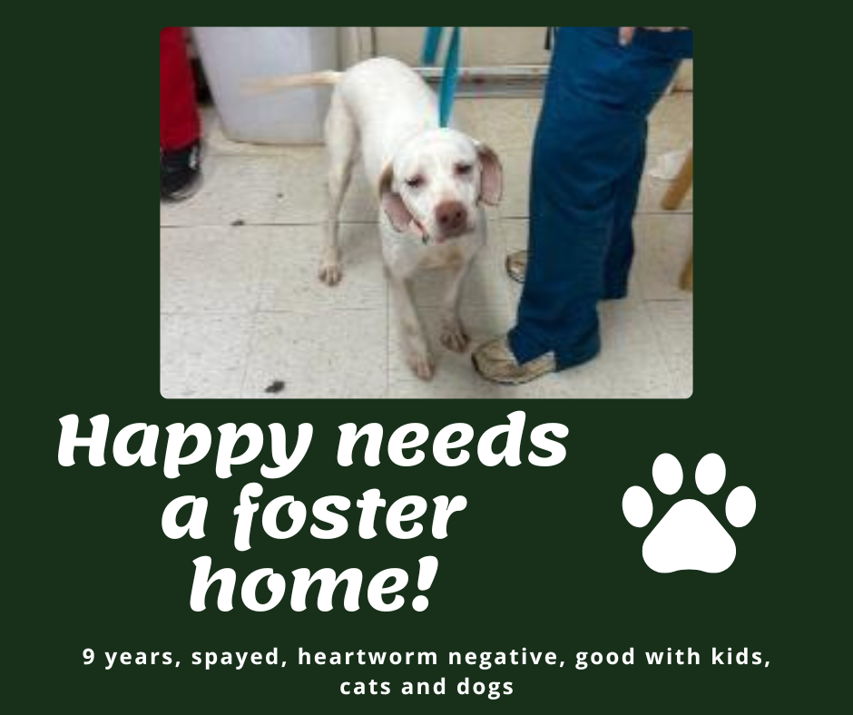 Happy is reportedly good with kids, dogs and cats! Happy arrived as a stray and has been spayed, noted to have beginnings of cataracts and is on medication for her heart. Neither her cataracts or heart slow her down and she is reportedly a very happy gal that has a zest for life. Happy is heartworm negative. Please consider opening your home to this sweet senior gal!