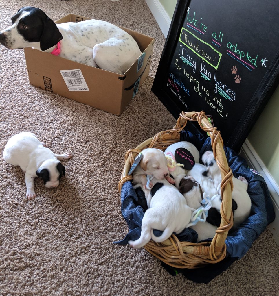 A very pregnant Pippa was rescued by PRO and a small army of volunteers were mobilised to help transport her from GA to her foster home in MD. Pippa had plans of her own, and gave birth to 9 puppies at her overnight stop in TN. A new plan was hastily arranged and Pippa, and her puppies, made it to their foster home.